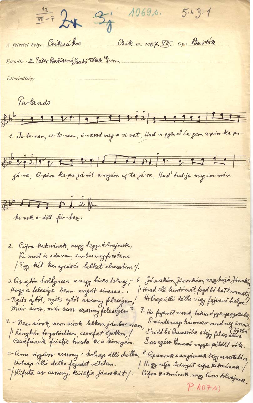 A dallam variánsait lásd: Bartók-rend, A-I 1069 variánscsoport (47 dallam).